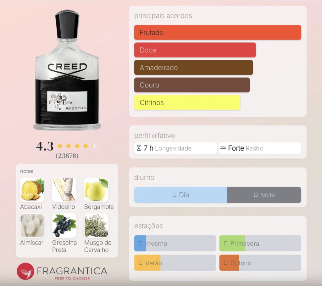 As notas de topo são: Bergamota, Groselha Preta, Maçã, Limão e Pimenta Rosa.