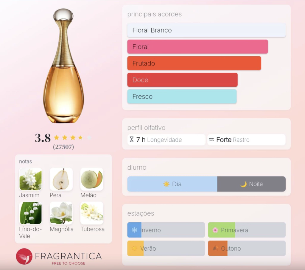 As notas de topo são: Pera, Melão, Magnólia, Pêssego, Mandarina e Bergamota.